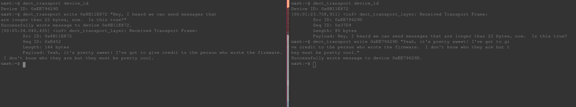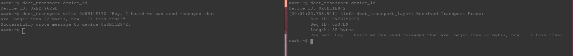 From the left shell, we send a message well beyond the link layer’s 22-byte payload limit to the device on the right. The transport layer fragments it, sends each fragment, waits for ACKs, and the full message arrives intact on the other side.